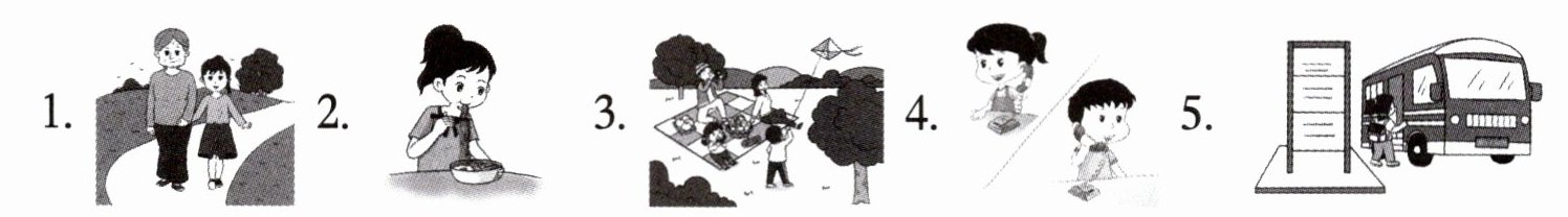 二、Read and number. Youyou 正在和妈妈聊天。请你读一读,给下列句子排序,组成一段完整的对话。