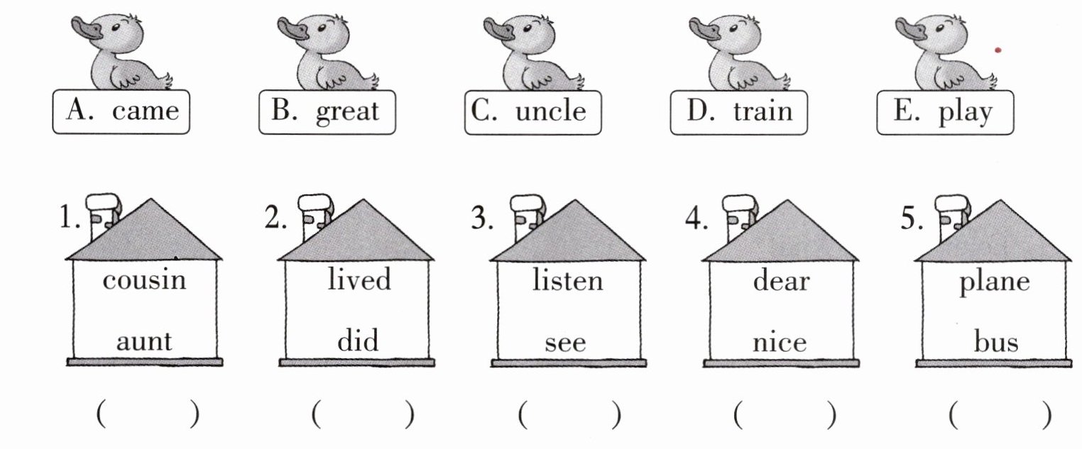 一、Read and choose. 小鸭子想回到自己的房子里。请你读一读,把小鸭子送回与其同类的房子里,并将其序号写在括号内。
