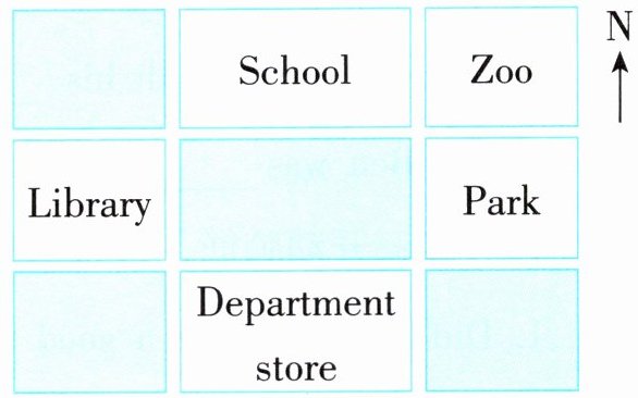 一、Look and write. 请你看一看下面的城市地图,用方位词把句子补充完整吧。