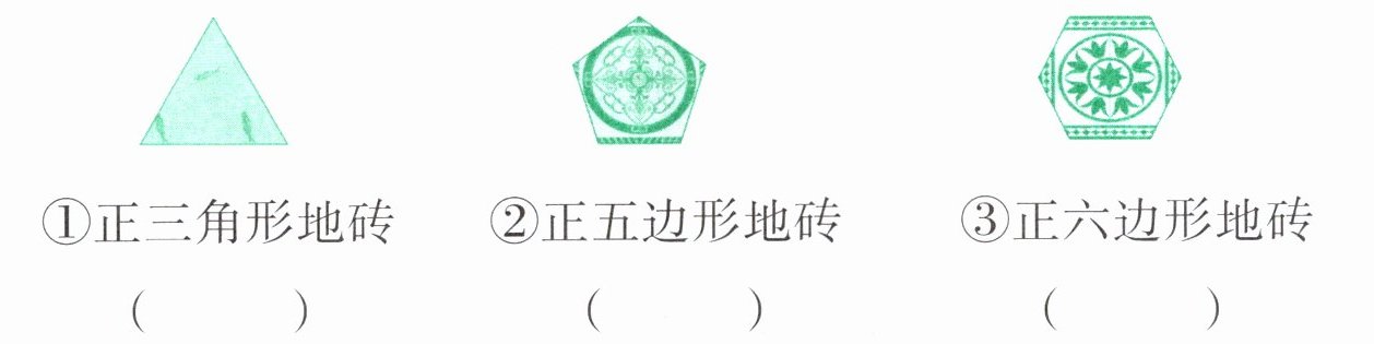 1. 暑假期间,常常的爸爸准备给客厅铺上地砖。下面哪些地砖可以密铺?请你帮常常的爸爸选一选,在你认为能密铺的地砖下面的括号内画“√”,并说明理由。