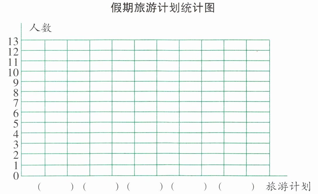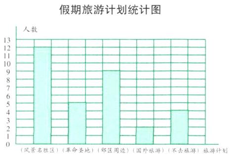 1. 放假前夕,淘淘调查了全班同学的假期旅游计划情况(每人只有一个旅游计划)。请你根据表格内容将下面的统计图补充完整。