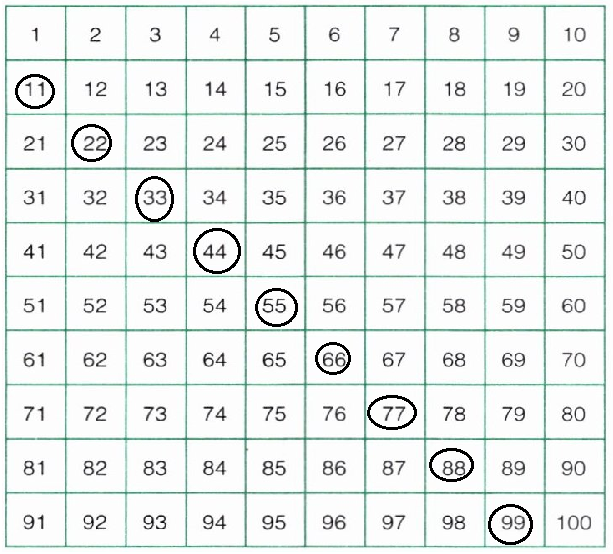 我们在百数表上研究了2,5等数的倍数的特征,下面请在百数表上圈一圈11的倍数,说一说这些数的特征,并分析为什么会有此特征。