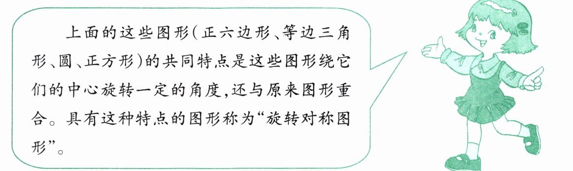 上面的这些图形(正六边形、等边三角形、圆、正方形)的共同特点是这些图形绕它们的中心旋转一定的角度,还与原来图形重合。具有这种特点的图形称为“旋转对称图形”。