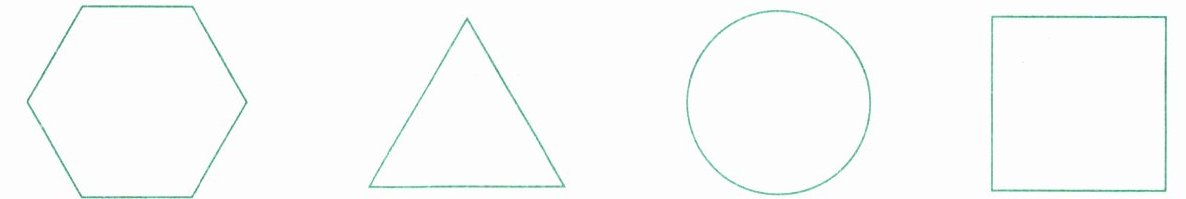 【解析】:观察这些图形,正六边形绕中心旋转$60^{\circ}$($360^{\circ}÷6 = 60^{\circ}$)、$120^{\circ}$($2×60^{\circ}$)、$180^{\circ}$($3×60^{\circ}$)、$240^{\circ}$($4×60^{\circ}$)、$300^{\circ}$($5×60^{\circ}$)、$360^{\circ}$($6×60^{\circ}$)等角度能与原图形重合;等边三角形绕中心旋转$120^{\circ}$($360^{\circ}÷3 = 120^{\circ}$)、$240^{\circ}$($2×120^{\circ}$)、$360^{\circ}$($3×120^{\circ}$)等角度能与原图形重合;圆绕中心旋转任意角度都能与原图形重合;正方形绕中心旋转$90^{\circ}$($360^{\circ}÷4 = 90^{\circ}$)、$180^{\circ}$($2×90^{\circ}$)、$270^{\circ}$($3×90^{\circ}$)、$360^{\circ}$($4×90^{\circ}$)等角度能与原图形重合。它们都符合绕中心旋转一定角度后与原来图形重合这一特点。