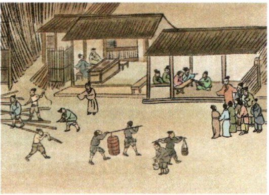画面开卷处描绘的是汴京近郊的风光。疏林薄雾,农舍田畴,春寒料峭,赶集的乡人驱赶着往城内送炭的毛驴驮队。在进入大道的岔道上,是众多仆从簇拥的轿乘队伍,从插满柳枝的轿顶可知是踏青扫墓归来的权贵。近处小路上骑驴而行的则是长途跋涉的行旅。树木新发的枝芽,调节了画面的色彩和疏密,表现出北国早春的气息。画面中段是汴河两岸的繁华情景。汴河是当时南北交通的孔道,也是北宋王朝国家漕运的枢纽。巨大的漕船,舳舻相接,忙碌的船工从停泊在河边的粮船上卸下沉重的粮包,纤夫们拖着船逆水行驶,一片繁忙景象。汴河上有一座规模宏敞的拱桥,其桥无柱,以巨木虚架而成,结构精美,宛如飞虹。桥的两端紧连着街市,车水马龙,热闹非凡。一艘准备驶过拱桥的巨大漕船的细节描绘,一直为人们所称道:船正在放倒桅杆准备过桥,船夫们呼唤叫喊,握篙盘索。桥上呼应相接,岸边挥臂助阵,过往行人聚集在桥头围观。而那些赶脚、推车、挑担的人们,却无暇一顾。这紧张的一幕,成为全画的一个高潮。后段描写汴京市区的街道。在高大雄伟的城楼两侧,街道纵横,房屋林立,茶坊、酒肆、脚店、肉铺、寺观、茅厕等一应俱全。各类店铺经营着罗锦布匹、沉檀香料、香烛纸马。另有医药门诊、大车修理、看相算命、修面整容,应有尽有。街上行人摩肩接踵,络绎不绝,士农工商,男女老少,各行各业,无所不备。