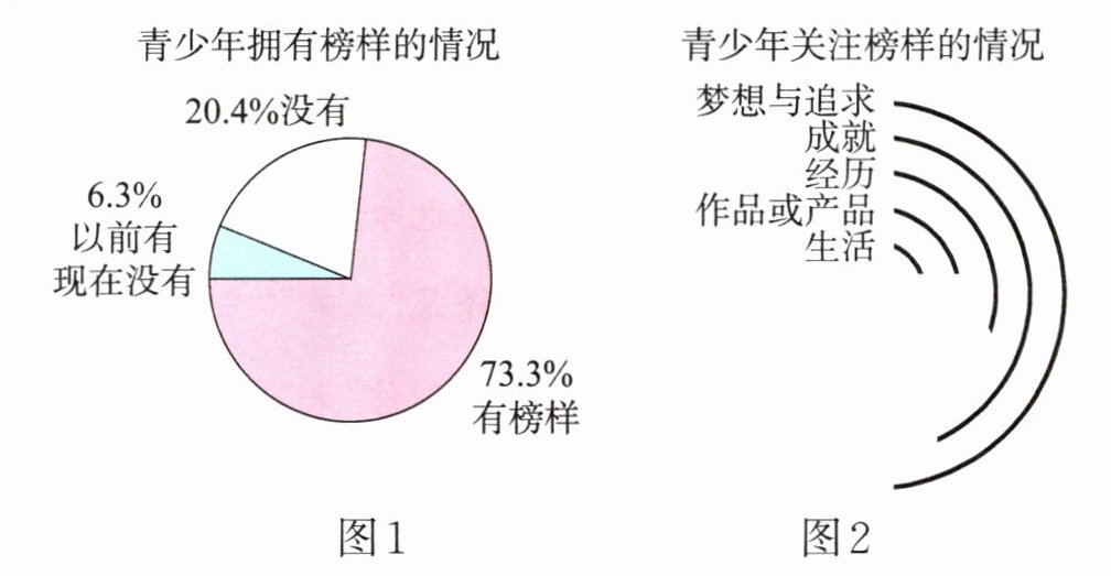 @@【答案】(示例)①绝大多数青少年是有榜样的;②大多数青少年关注榜样的梦想追求、成就和经历。【解析】本题考查图文转换。阅读材料可知,图1是对青少年拥有榜样的情况的调查,其中有榜样的占73.3%,没有榜样的占20.4%,以前有现在没有的占6.3%,因此可概括为:绝大多数青少年是有榜样的;图2是青少年关注榜样的情况信息,弧线越长,说明关注度越高,关注度前三分别是梦想与追求、成就、经历,据此可概括为:大多数青少年关注榜样的梦想追求、成就和经历。