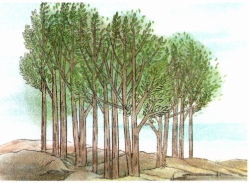 那是力争上游的一种树,笔直的干,笔直的枝。它的干通常是丈把高,像加过人工似的,一丈以内绝无旁枝。它所有的丫枝一律向上,而且紧紧靠拢,也像加过人工似的,成为一束,绝不旁逸斜出;它的宽大的叶子也是片片向上,几乎没有斜生的,更不用说倒垂了;它的皮光滑而有银色的晕圈,微微泛出淡青色。这是虽在北方风雪的压迫下却保持着倔强挺立的一种树!哪怕只有碗那样粗细,它却努力向上发展,高到丈许,两丈,参天耸立,不折不挠,对抗着西北风。