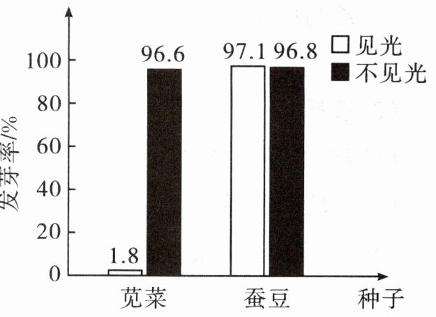 (2024·吉林)小刚通过实验探究光照对种子萌发的影响(其他环境条件均适宜),根据实验结果绘制了如图所示的统计图。下列分析正确的是 (