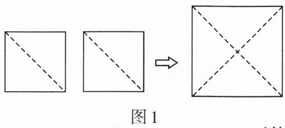 22. 【问题发现】如图 1,把两个面积都为 $1\mathrm{cm}^2$ 的小正方形分别沿对角线剪开,将所得的 4 个直角三角形拼成一个大正方形,则该大正方形的边长为