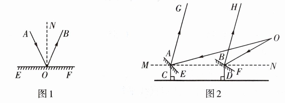 我们知道,光反射时,反射光线、入射光线和法线在同一平面内,反射光线、入射光线分别在法线两侧,反射光线与法线的夹角(反射角)等于入射光线与法线的夹角(入射角). 如图1,$EF$为一镜面,$AO$为入射光线,入射点为点$O$,$ON$为法线(过入射点$O$且垂直于镜面$EF$的直线),$OB$为反射光线,此时反射角$∠BON$等于入射角$∠AON$. 现有一激光反射装置,如图2,$AE,BF$是两块可以分别绕点$A,B$转动的镜面,点$O$是激光发射装置. 由点$O$发出的激光照射在点$A$和点$B$处,$AG,BH$是两束反射光线. 点$A,B$处于同一水平高度,已知入射光线$OA,OB$与水平线$MN$的夹角分别为$15^{\circ }$和$30^{\circ }$,镜面$AE$与立杆$AC$的夹角$∠EAC=45^{\circ }$.