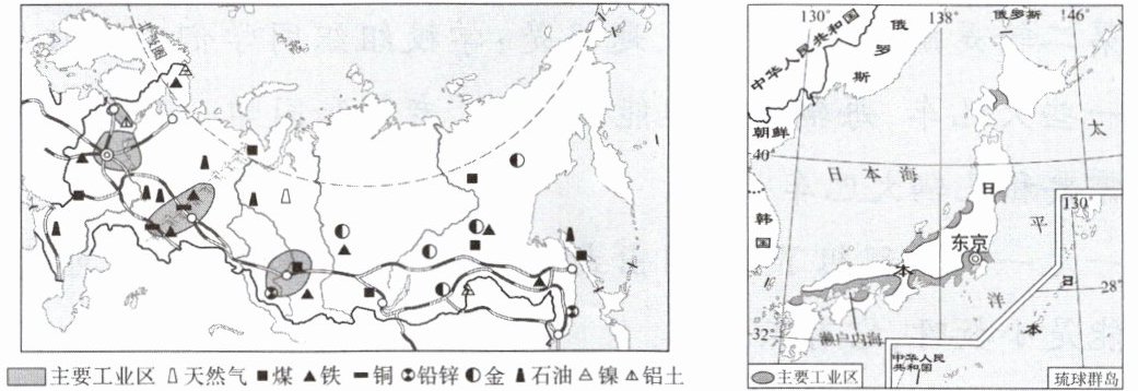 日本矿产资源贫乏,俄罗斯矿产资源丰富,日本对俄投资,多在油气项目方面。读俄罗斯矿产资源分布图及日本主要工业区分布图,完成3~4题。