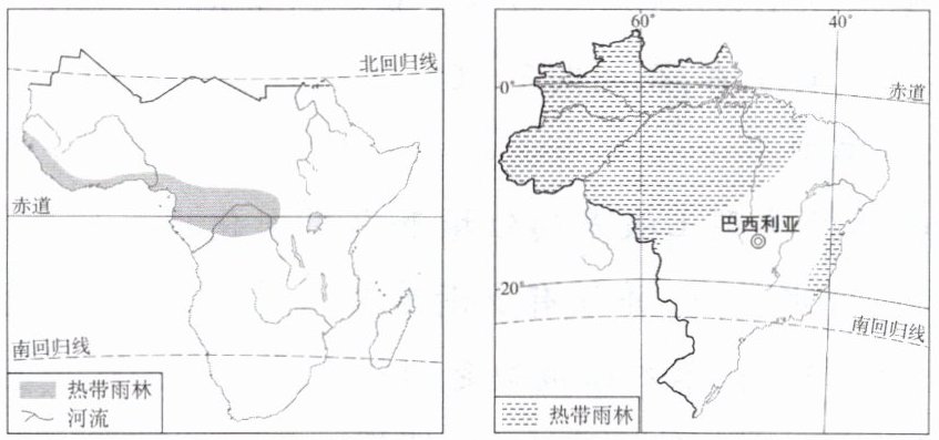 (2024·山东淄博)撒哈拉以南非洲和巴西都有大面积热带雨林分布。另外,两地在自然和人文环境等方面有很多相似之处。下图为撒哈拉以南非洲和巴西热带雨林分布示意图。据此完成3~4题。