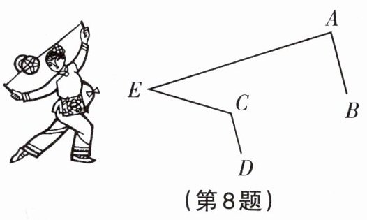 8. 某同学在研究中国传统体育项目抖空竹时,把抖空竹的动作抽象成数学问题:如图,已知$AB// CD$,$∠BAE = 87^{\circ}$,$∠DCE = 121^{\circ}$,则$∠E$的度数是(
