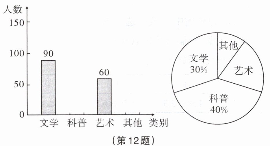 12. 某校计划购买一批课外读物,为了了解学生对课外读物的需求情况,学校进行了一次关于“我最喜爱的课外读物”的调查,设置了“文学”、“科普”、“艺术”和“其他”四个类别,规定每人必须选择且只能选择其中一类.现从全体学生的调查表中随机抽取了部分学生的调查数据进行统计,并把统计结果绘制成如图所示的两幅不完整的统计图,则在扇形统计图中,“艺术”类读物所在扇形的圆心角的度数是