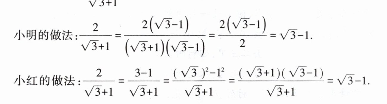 小红的做法: $\frac{2}{\sqrt{3} + 1} = \frac{3 - 1}{\sqrt{3} + 1} = \frac{(\sqrt{3})^{2} - 1^{2}}{\sqrt{3} + 1} = \frac{(\sqrt{3} + 1)(\sqrt{3} - 1)}{\sqrt{3} + 1} = \sqrt{3} - 1$.