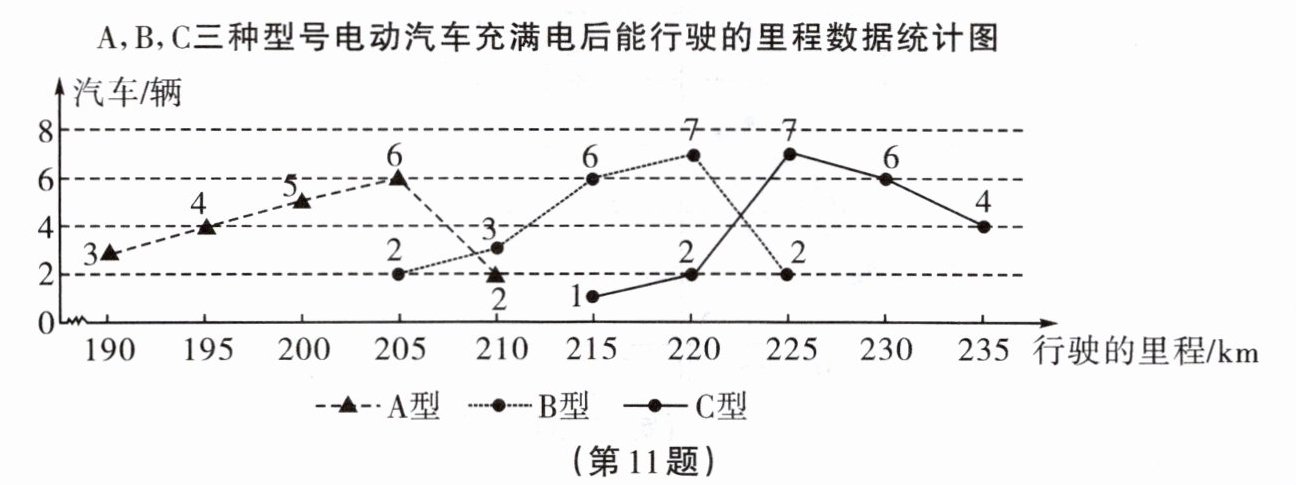 11. 某公司有A,B,C三种型号电动汽车出租,每辆车每天的费用分别为300元、380元、500元.阳阳打算从该公司租一辆汽车外出旅游一天,往返行程为210km.为了选择合适的型号,他通过网络查询获得三种型号汽车充满电后能行驶的里程数据如图所示.