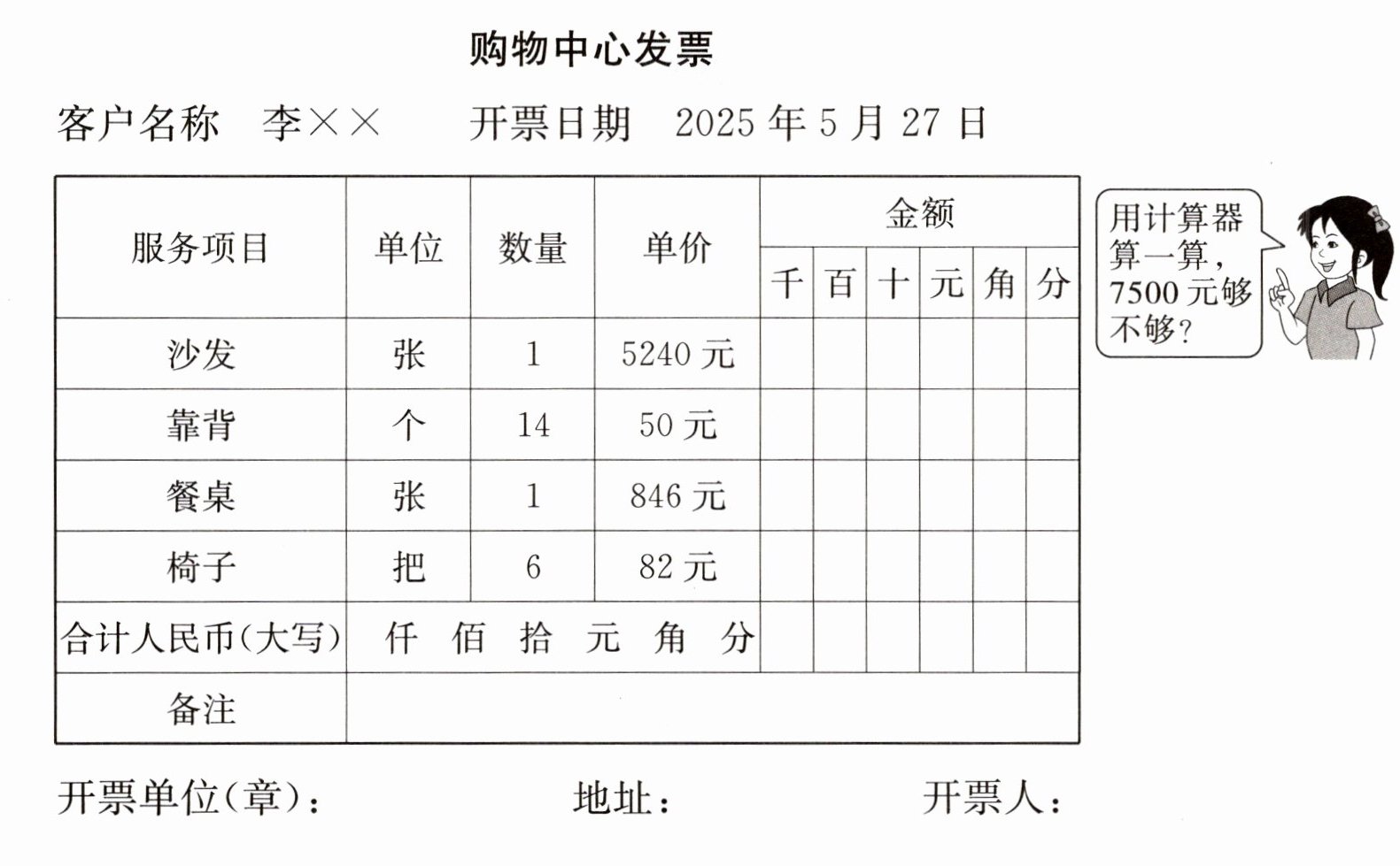 下面是李阿姨的购物发票,请将表格中“金额”一栏补充完整。