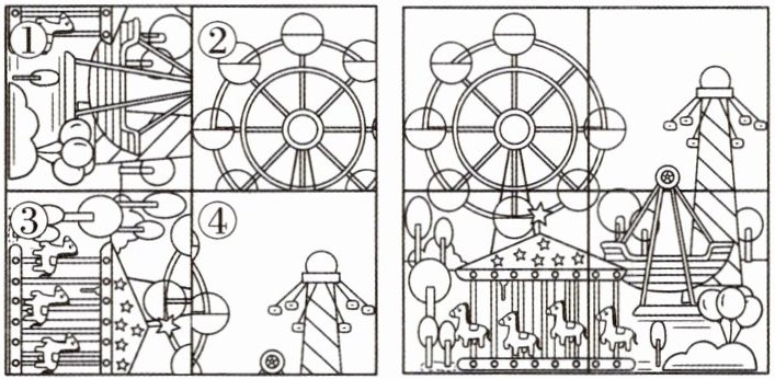 2. 以最少的步骤(平移和旋转)将下面的拼图还原成右侧的样子,奇奇应该怎样做?(请把步骤写出来)