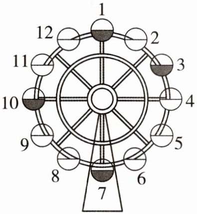 解:观察摩天轮图示,共有12个舱,按顺时针依次编号1-12,最上面为1号舱,最下面为7号舱。