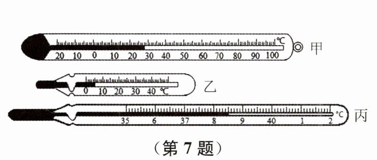 7. 某种药品需保存在低于$8^{\circ }C$的环境中. 夏季,为监测运输过程中药品温度是否超标,应在冷藏箱内放置图示三支温度计中的
