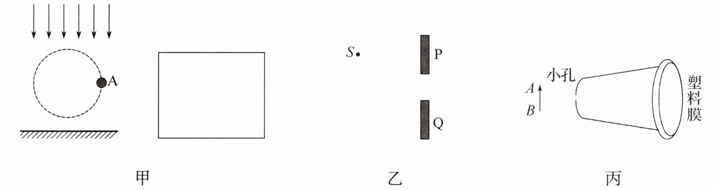 17. (1)如图甲所示,平行太阳光垂直于水平地面射下,A为不透明小球,小球在竖直平面内沿图中圆形虚线轨迹运动,请在右框中画出小球的影子在地面上运动的虚线轨迹.