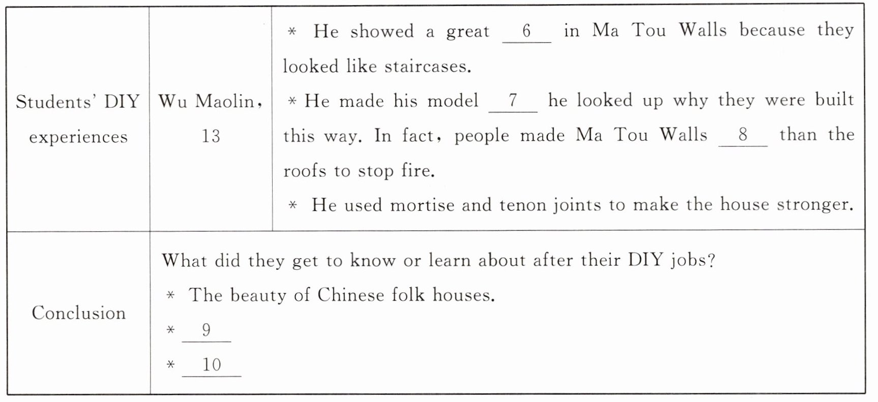 I found Ma Tou Walls in the area south of the Yangtze River interesting because they looked like staircases(楼梯). Before making my model, I looked up why they were built this way. In these areas, houses are built close together, so if one house catches fire, it could quickly spread(传播) to others. To stop this, people build Ma Tou Walls that rise(上升) above the roofs. While making the model, I used mortise and tenon joints to make the house stronger. By doing this, I knew ancient people were so clever. And it also helped me learn more about traditional Chinese culture.
