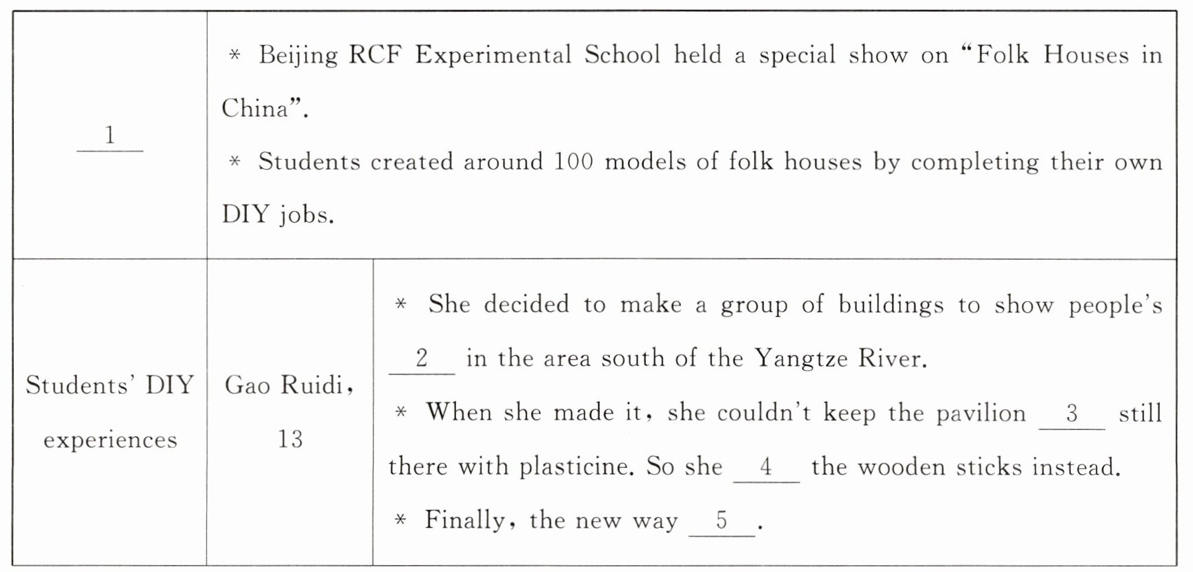 新素养·文化意识 A special show on “Folk(民间) Houses in China” took place in the RCF Experimental School in Beijing on September 17. Around 100 models of folk houses made by students were on show, including homes from canal towns in the area south of the Yangtze River, Xizang and other places. Students created their beautiful models by completing their own DIY jobs.