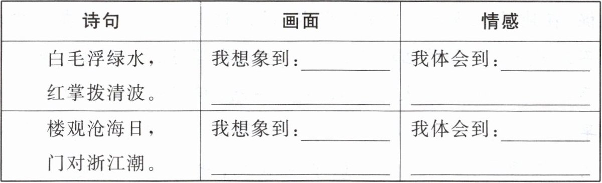 |白毛浮绿水,红掌拨清波。|我想象到:______|我体会到:______|