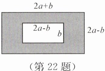 22. 如图,某校园内有一块长为$(2a+b)m$、宽为$(2a-b)m的长方形空地(a>b)$.为美化环境,计划在这块空地上修建一个长为$(2a-b)m$;宽为$bm$的长方形花圃,并将花圃四周余下的空地修建成通道.