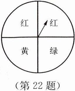 22. 如图所示,有一个转盘分成 4 个相同的扇形,颜色分为红、绿、黄三种,指针的位置固定,转动转盘后任其自由停止,其中的某个扇形会恰好停在指针所指的位置(指针指向两个扇形的交线时,当做指向右边的扇形),求下列事件的概率: