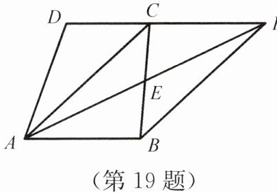 19. 如图所示,已知在四边形$ABCD$中,$AB// CD$,$E是BC$的中点,直线$AE交DC的延长线于点F$。试判断四边形$ABFC$的形状,并证明你的结论。