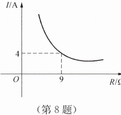 8. 已知蓄电池的电压为定值,使用蓄电池时,电流$I$(单位:$A$)与电阻$R$(单位:$\Omega$)是反比例函数关系,它的图像如图所示,如果以此蓄电池为电源的用电器,其限制电流不能超过$10A$,那么用电器可变电阻$R$应控制的范围是(