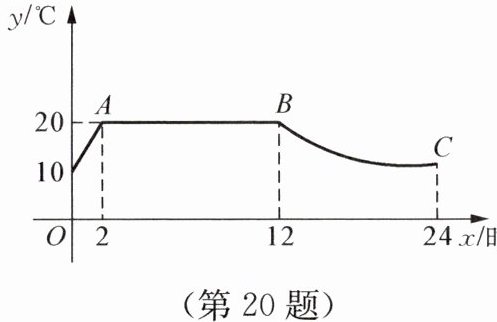 20. 某市某蔬菜生产基地用装有恒温系统的大棚栽培一种适宜生长温度为$15\sim 20^{\circ }C$的新品种,如图所示是某天恒温系统从开启到关闭及关闭后,大棚里温度$y(^{\circ }C)随时间x$(时)变化的函数图像,其中$AB$段是恒温阶段,$BC段是双曲线y= \frac {k}{x}$的一部分,请根据图中信息解答下列问题: