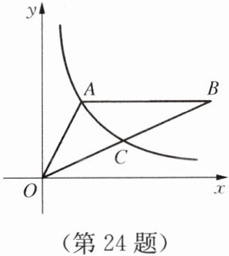 24. 如图所示,双曲线$y= \frac {k}{x}(x>0)经过\triangle OAB的顶点A和OB的中点C$,$AB// x$轴,点$A的坐标为(2,3)$。