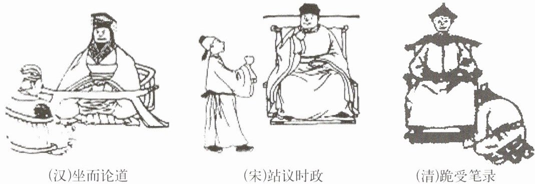 (1)从材料一的图片可以看出,汉朝时丞相地位较高,君臣礼仪相对宽松;到宋朝时,丞相需站议时政,君臣礼仪变得严格;清朝时,官员跪受笔录,君臣礼仪更加森严。这反映出中国古代政治制度中皇权不断加强,相权不断削弱的演变趋势。