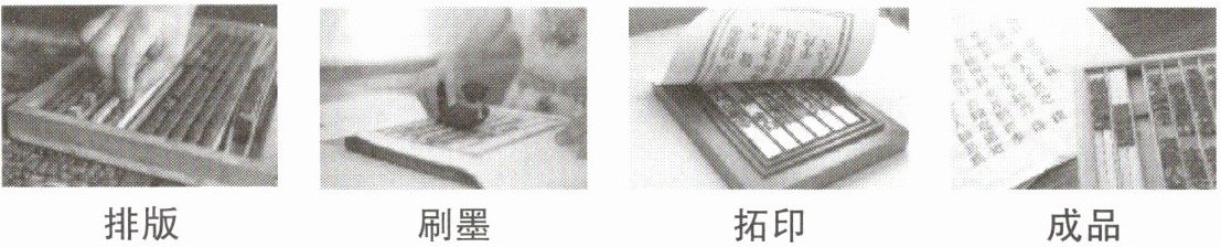 图片中展示了“排版”“刷墨”“拓印”“成品”等环节,这是活字印刷术的操作流程。活字印刷术是一种古代印刷方法,通过将单个字的铅字排版,再刷上油墨,覆盖纸张进行拓印,最终得到印刷成品。