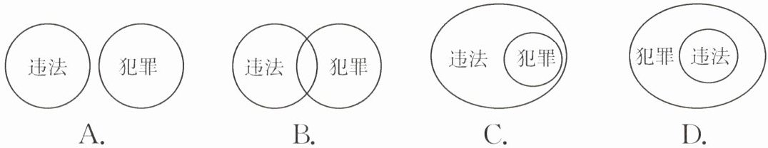 10. 违法行为是指出于过错违反法律、法规的规定,危害社会的行为;而犯罪是具有严重社会危害性、触犯了刑法、应当受到刑事处罚的行为。下图所示是几个同学对违法与犯罪关系的理解,其中正确的是 ( )