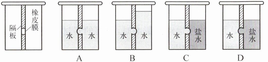 4. 某同学用如图所示的装置探究液体内部压强的特点。容器中间用隔板分成左右两部分,隔板下部有一圆孔用薄橡皮膜封闭。容器中加入液体后,橡皮膜两侧压强不同时,其形状会发生改变,下列图形符合实验事实的是( )