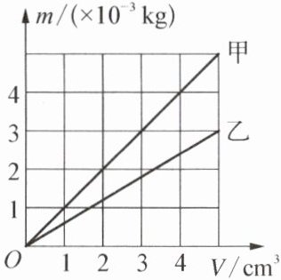 10. 甲、乙两种物质,他们的质量和体积的关系如图所示,由图可知,其中密度较大的是____物质,甲的密度是$____g/cm^3。$
