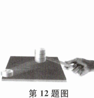 12. 如图所示,用尺子快速击打最下面的棋子时,该棋子会飞出,说明____;上面的棋子由于____而不会飞出,它们在____的作用下,落在正下方。