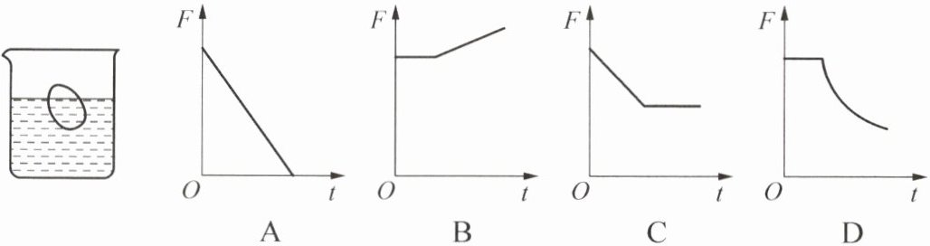 9. 小凡同学看到鸡蛋浮在盐水面上,如图所示.于是,他沿杯壁缓慢加入清水使鸡蛋下沉,在此过程中,鸡蛋受到的浮力 F 随时间 t 的变化图像可能是( )