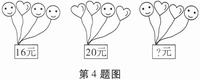 4. 小岩打算购买气球装扮学校“毕业典礼”活动会场,气球的种类有笑脸和爱心两种,两种气球的价格不同,但同一种气球的价格相同.由于会场布置需要,购买时以一束(4个气球)为单位,已知第一、二束气球的价格如图所示,则第三束气球的价格为 (