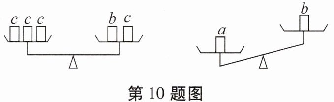 10. 设$ a $,$ b $,$ c $表示三种不同物体的质量,用天平称两次,情况如图所示,则这三种物体的质量按从小到大的顺序排列正确的是 (