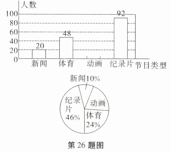 26. 某中学为了了解学生对新闻、体育、动画、纪录片四类电视节目的喜爱程度,随机抽取了部分学生进行调查(每人限选1项),现将调查结果绘制成如图所示的两幅不完整的统计图.