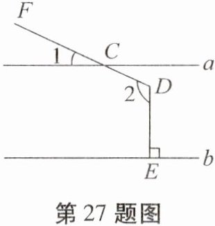 27. 如图,直线$a // b$,射线$DF与直线a相交于点C$,过点$D作DE \perp b于点E$.已知$∠1 = 25^{\circ}$,求$∠2$的度数.
