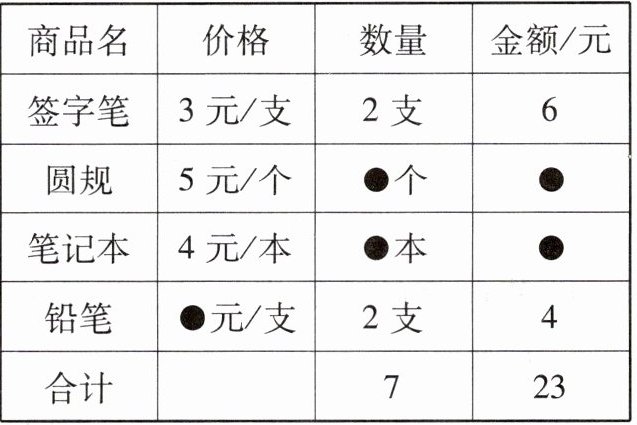 (1)设小陈购买圆规$x$个,笔记本$y$本。根据题意,得$\begin{cases}x + y = 7 - 2 - 2\\5x + 4y = 23 - 6 - 4\end{cases}$,解得$\begin{cases}x = 1\\y = 2\end{cases}$。$∴$小陈购买圆规 1 个,笔记本 2 本。