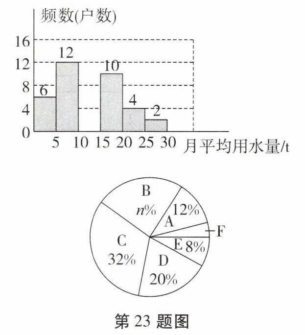 23. 某校七(1)班学生为了解某小区家庭月平均用水情况,随机调查了该小区部分家庭月平均用水量,并绘制成如图所示的频数分布直方图(每组数据不包括最小值,包括最大值)和扇形图(不完整).请你根据提供的信息,解答下列问题.