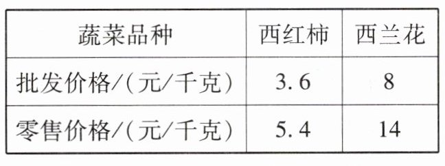 (1)设批发西红柿 x kg,批发西兰花 y kg. 由题意,得 $\begin{cases}x + y = 300,\\3.6x + 8y = 1520.\end{cases}$ 解得 $\begin{cases}x = 200,\\y = 100.\end{cases}$