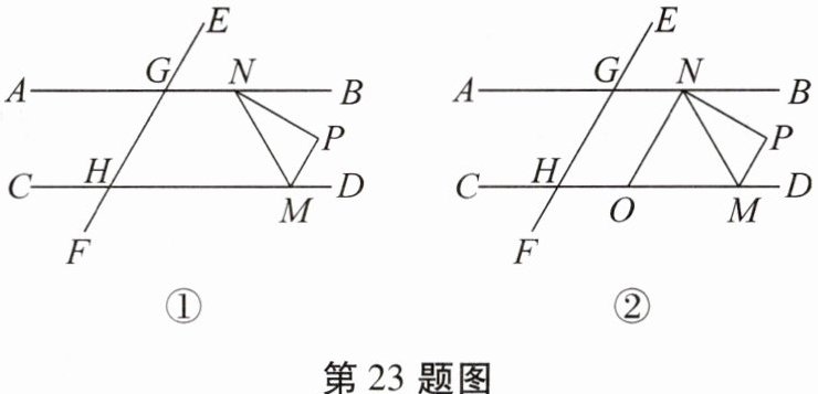 23. 如图,直线 $AB// CD$,直线 $EF$ 与 $AB,CD$ 分别交于点 $G,H,\angle EHD= \alpha(0^{\circ}<\alpha<90^{\circ})$. 小安将一个含 $30^{\circ}$ 角的直角三角尺 $PMN$ 按如图所示的方式放置,使点 $N,M$ 分别在直线 $AB,CD$ 上,其中 $\angle P= 90^{\circ},\angle PMN= 60^{\circ}$.