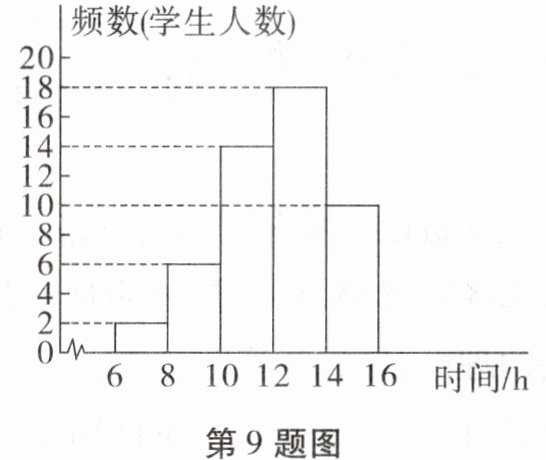 9. 为了了解本校七年级700名学生上学期参加社会实践活动的时间,随机对该年级50名学生进行了调查.根据收集的数据绘制了如图所示的频数分布直方图,则以下说法正确的是 (
